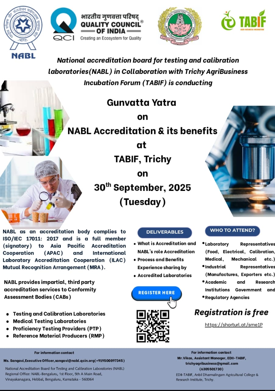 Lecture Hall Anbil Dharmalingam Agricultural College & Research Institute, TrichyEDII–TABIF in collaboration with NABL (National Accreditation Board for Testing and Calibration Laboratories) is organizing an Awareness Program on NABL Accreditation & its Benefits. 🗓️ Date: 30th September 2025 (Tuesday) 📍 Venue: Lecture Hall, Anbil Dharmalingam Agricultural College & Research...